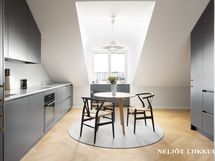 - Jääkaappi/pakastin, induktioliesi, liesikupu/tuuletin, kiertoilmauuni, astianpesukone, aamiaiskaappi, työtasot kvartisia, lattialämmitys, lattiat kalanruotoparkettia