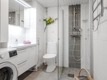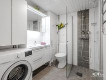 - Pesutilojen varusteet: WC-istuin, suihku, suihkuseinä, lattialämmitys, pesuallas, peilikaappi, bidee-suihku, pesukone ja kuivauspatteri (sähkö). Pesutilojen kuvaus: Tilava ja tyylikäs kylpyhuone remontoitu putkiremontin yhteydessä 2021.