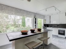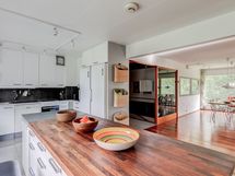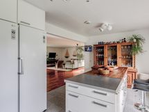 - Tilaa isolle ruokapöydälle, Paljon kaappitilaa, Paljon työskentelytilaa, Puutasot, Laminaattitasot, Astianpesukone, Pesukoneliitos, Keraaminen liesi, Liesikupu, Jääkaappi, Pakastin
