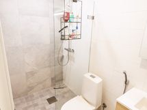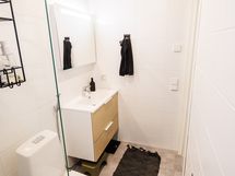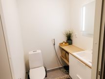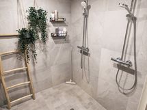 - Alakerran kylpyhuoneessa kaksi sadesuihkua. Yläkerran wc:ssä yksi sadesuihku ja lasinen kääntyvä suihkuseinä. Molemmissa wc-tiloissa hyvät säilytystilat.