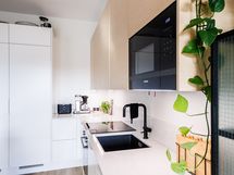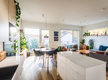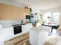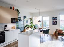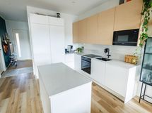 - Puustellin keittiö integroiduilla Siemensin Studioline-malliston kodinkoneilla; astianpesukone, kalusteuuni, induktioliesi, liesituuletin, mikro, täyskorkea jääkaappi, täyskorkea pakastin. Kvartsitasot. Led-valaistus kaappien alla.