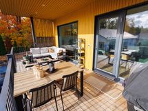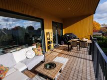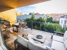 - Suuri parveke, johon mahtuu esim. sohvaryhmä, ruokailuryhmä ja grilli. Toimii olohuoneen jatkeena ja tuo huomattavaa lisätilaa etenkin kesäisin. Parveke on mahdollista lasittaa, jolloin käyttömahdollisuudet ovat vieläkin laajemmat.