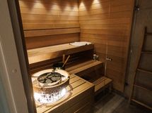 - Harvia Cilindro kiuas kosketuspaneelilla ja tunnelmavalaistuksella. Tervaleppä lauteet. Katossa pistemäiset tunnelmavalot. Lasiseinä suihkutilaan.