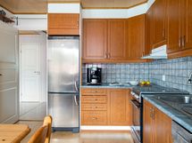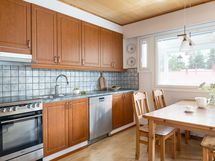- Jääkaappi/pakastin, astianpesukone, keraaminen liesi uunilla ja liesituuletin. Tasojen ja kaapistojen välitila on laatoitettu ja laskutila on laminaattia.