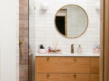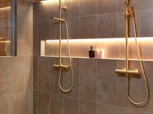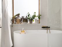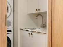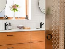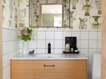 Kylpyhuoneiden allaskaapeissa materiaaleina on käytetty lämpimiä puuviiluja ja luonnonkivitasoja. Master-makuuhuoneen kylpyhuoneeseen on valittu persoonallista tiikkiä, joka istuu täydellisesti talon aikakauden henkeen ja alkuperäisiin ikkunankarmeihin. Tämä yhdistettynä moderneihin terrazzo laattoihin luo raikkaan kokonaisuuden.