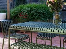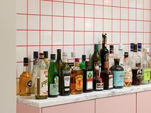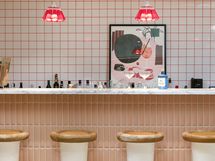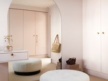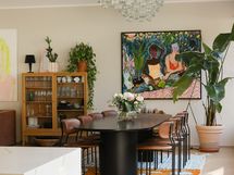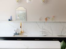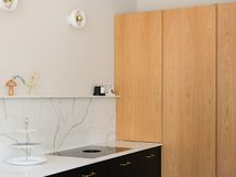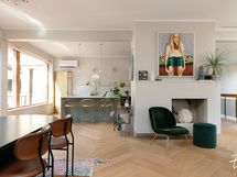 Keittiön ehdoton katseenvangitsija on heleän vihreällä sormipaneelilla ja Calacatta -marmorilla vuorattu saareke yhdistettynä vintage baarituoleihin. Saarekkeen taso pidettiin tyhjänä ja toiminnot sijoitetiin avokeittiön takaseinälle - näin saarekkeen äärelle jää runsaasti tilaa elämälle ja yhdessä ololle.