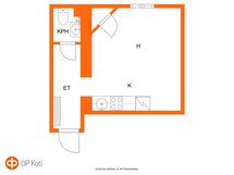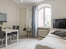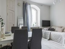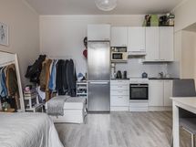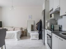- Jääkaappipakastin, keraaminen liesi, liesituuletin, kaapistot, kiinteät valaisimet.