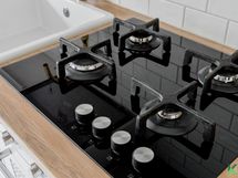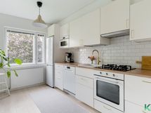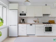 - Kaapistot, jääkaappi/pakastin, astianpesukone, integroitu mikroaaltouuni, kaasuliesi, sähkötoiminen uuni, liesituuletin