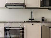 - Kaapistot, integroitu uuni, induktioliesitaso, liesituuletin (aktiivihiili), astianpesukone, jääkaappikastin (retrokaappi), kiinteät valot, laminaattitasot.