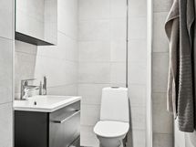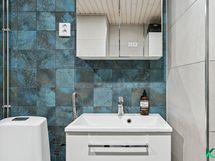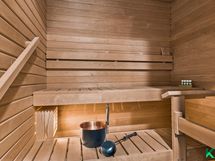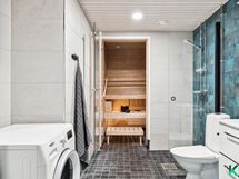 - Kph: wc-istuin, bide-suihku, lavuaari, allaslaatikosto, peilikaappi, kääntyvät suihkuseinät, lattialämmitys, suihku, pystykaappi, pyykinpesukoneliitäntä. Sauna: tervaleppälauteet. Erillinen wc: wc-istuin, lavuaari, bide-suihku, allaslaatikosto, peilikaappi.
