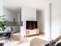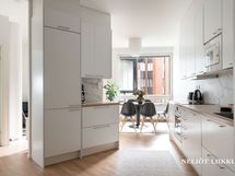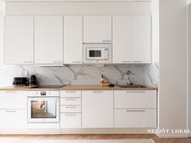 - Putkimallisessa, kumpaankin suuntaan avoimessa keittotilassa on vaaleat kiintokalusteet (JS-Keittiö). Varustus: