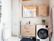 suihku, suihkuseinä, wc-istuin, bideesuihku, peilikaappi, pesuallas, allaslaatikosto, pesukoneliitäntä, seinäkaappi. Seinät ja lattia laatoitettu, katto paneloitu. Katossa upotetut halogeenit. Lattialämmitys.