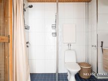 - Tilavassa saunassa seinät ja katto paneloitu, lattia laatoitettu. Sähkökiuas (Harvia Termonator).