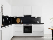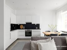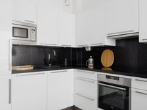 - Keittiön varusteet: Jääkaappipakastin, liesituuletin, mikroaaltouuni, astianpesukone ja erillisuuni. Liesi: Induktioliesi.