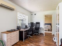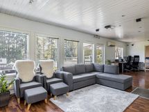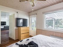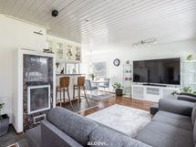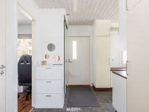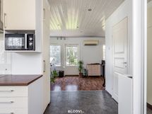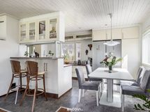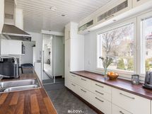 - Keittiön varustukseen kuuluu liesitaso, kalusteuuni, liesituuletin, astianpesukone, jääkaappi ja pakastin (uusittu 2023). Työtasot ovat laminaattia. Lattia on laattaa, seinät maalatut. Hyvin tilaa ruokailuun.