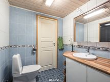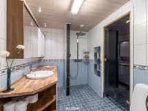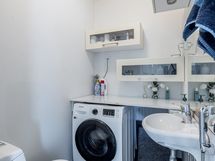 - Pesutilojen kuvaus: Kylpyhuoneen varustukseen kuuluu wc-istuin, allas- ja peilikaappi, työtasoa, naulakot ja lattialämmitys (sähkö). Lattia on laattaa, seinät kaakelia ja katto paneloitu. Katossa upotetut spottivalot. Erillisen WC:n kuvaus: Erillisen wc:n varustukseen kuuluu peilikaappi työtasoa, tilavaraus pyykinpesukoneelle, wc-istuin, bidee-suihku ja hyllyjä. Lattia on laattaa, katto paneelia ja seinät maalatut.