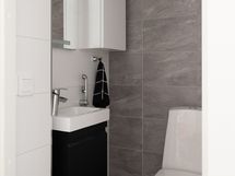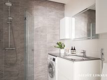 - Pesutilojen kuvaus: Suihku, suihkuseinät, wc, pyykinpesukoneliitäntä, allas, allaskaappi, peilikaappi, lattialämmitys, lattiat ja seinät laattaa. Erillisen WC:n kuvaus: WC, bideesuihku, allas, allaskaappi, seinäkaappi, peili, lattiat ja seinät laattaa.