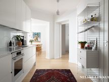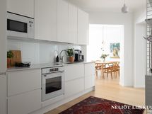 - Jääkaappi/pakastin, induktioliesi, liesikupu/tuuletin, kiertoilmauuni, integroitu mikroaaltouuni, astianpesukone, kiinteät valaisimet, kaapistot, työtasot kvartsia, lattiat lankkuparkettia
