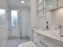 - Suihku, Pesukoneliitäntä, Mukavuuslattialämmitys, Tilaa pesukoneelle, Kaapisto, Allas, Suihkuseinä, WC-istuin, Peilikaappi