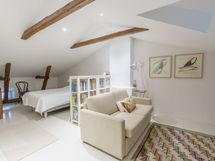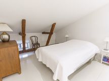 Makuuhuone on tilavassa yläkerrassa.