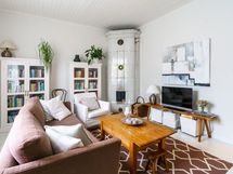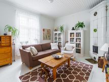 - Kauniissa, valoisassa olohuoneessa on toimiva kakluuni. Lattiat ovat leveät lankkulattiat.