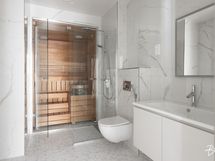 Keittiön modernit kodinkoneet ovat Mielen mallistosta. Huoneistossa on kolme makuuhuonetta. Yhden makuuhuoneen yhteydessä on lisäksi oma parveke. Viihtyisä kylpyhuone ja sopivan kokoinen sauna. Lisäksi kodista löytyy erillinen wc sekä kodinhoitohuone.