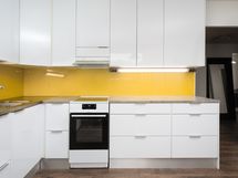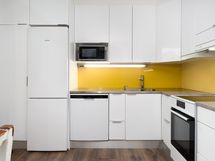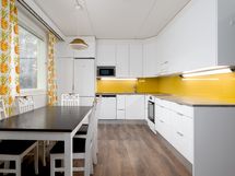 - Paljon kaappitilaa, Paljon työskentelytilaa, Tilaa isolle ruokapöydälle, Laminaattitasot, Terästasot, Astianpesukone, Jää-pakastinkaappi, Induktioliesi