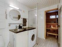 - Suihku, Suihkuseinä, Pesukone, Allaskaappi, Laattaseinä, Laattalattia