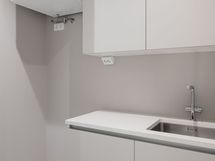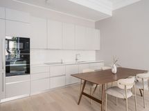 - Olohuoneen yhteydessä avokeittiö. Työtasot komposiittia. Integroidut Mielen kodinkoneet, astianpesukone, mikroaaltouuni, erillisuuni ja jääkaappi/pakastin sekä induktioliesi ja liesituuletin.