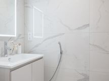 - Pesutilojen kuvaus: Masterbedroomin yhteydessä kylpyhuone, jossa wc-istuin, pesuallas, suihkusyvennys sekä sauna. Erillisen WC:n kuvaus: Erillinen wc eteisessä. Wc-istuin, allaskaapisto, peili, bidee-suihku.