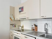 - Jääkaappi/pakastin, uuni, astianpesukoneliitäntä, astianpesukone, kaapistot, keraaminen liesi, liesituuletin filtterillä, irralliset saarekkeet