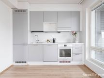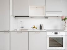 - Tyylikkäät harmaat kaapistot. Electroluxin integroidut kodinkoneet; jääkaappi/pakastin, astianpesukone, induktioliesitaso, liesituuletin, kalusteuuni sekä paikka mikroaaltouunille. Työtasot