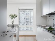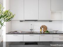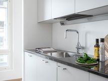 - Avokeittiössä saareke olohuoneen suuntaan. Tyylikkäät harmaat kaapistot. Electroluxin integroidut kodinkoneet; jääkaappi/pakastin, astianpesukone, induktioliesitaso, liesituuletin, kalusteuuni sekä paikka mikroaaltouunille. Mustat kivitasot. Tammiparketti.