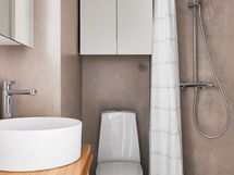 säilytyskaappi, wc-istuin ja sadesuihku/suihku. Tilassa