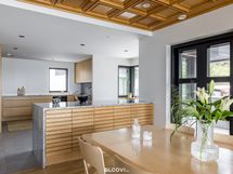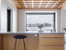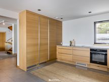 Keittiössä kohtaavat tammen lämmin sävy, kivitasojen ajattomuus ja huippuluokan kodinkoneet. Saareke, aamiaiskaappi sekä korkeatasoinen toteutus tekevät siitä ruoanlaitosta nauttivan unelman. Avara ruokailutila sijoittuu meren suuntaan ja tarjoaa puitteet isommallekin seurueelle.
