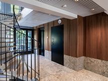 Omalla tontilla sijaitsevan rakennuksen autohallista pääsee hissillä suoraan kotiovelle.