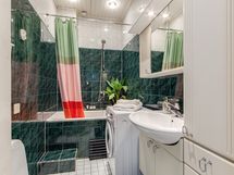 - Pesutilojen varusteet: Pesukoneliitäntä, wc-istuin, allaskaappi, lattialämmitys, peilikaappi, kylpyamme, suihku ja kiinteät valaisimet.