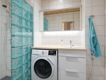- Pesutilojen varusteet: WC-istuin, allaskaappi, peili, suihku ja kiinteät valaisimet.