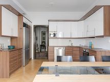 - Keittiön varusteet: Liesituuletin, liesi, jääkaappipakastin ja astianpesukone. Liesi: sähköliesi. Työtason materiaali: Puu. Keittiön kaapinovet laminaattia.
