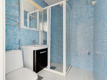 - Pesutilojen varusteet: WC-istuin, pesukoneliitäntä, suihkuseinä, peilikaappi ja kiinteät valaisimet.