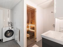 - Pesutilojen varusteet: Allaskaappi, pesukoneliitäntä, peilikaappi ja suihku. Pesutilojen kuvaus: peneelikatto. Erillisen WC:n varusteet: Bidee-suihku. Erillisen WC:n kuvaus: peili.