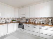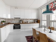 - Keittiön varusteet: Jääkaappipakastin, astianpesukone, liesi, liesituuletin ja kiinteät valaisimet. Liesi: Keraaminen liesi ja muu. Valkoiset kaapistot, keittiön välitila: mosaiikkilaatta.