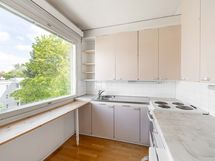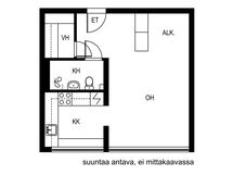 - Keittiön varusteet: Jääkaappi, liesi ja kiinteät valaisimet. Liesi: sähköliesi. Työtason materiaali: Laminaatti ja metalli. keittiön välitila: valkoinen laatta