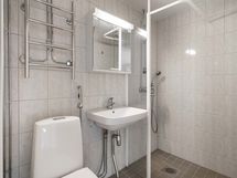 - Pesutilojen varusteet: Peilikaappi, pesukoneliitäntä, suihku, suihkuseinä ja wc-istuin. Pesutilojen kuvaus: seinät: vaaleanharmaa laatta lattia: tummanharmaa laatta