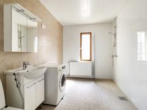 - Pesutilojen varusteet: Allaskaappi, peilikaappi (valolla), suihku, pesukone, suihkuseinä (kääntyvä), wc-istuin, bidee-suihku, pesukoneliitäntä ja pesuallas. Pesutilojen kuvaus: Remontoitu LVIS-saneerauksen yhteydessä ja juuri valmistunut. Isoon kylpyhuoneeseen mahtuu myös kodinhoitotilaa.