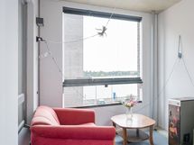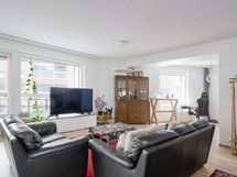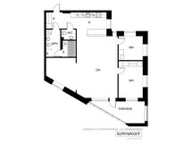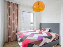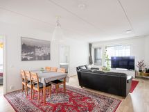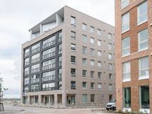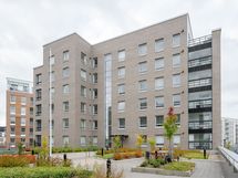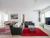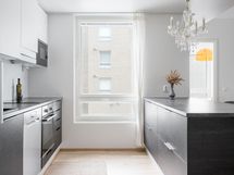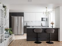 - Tummasävyinen keittiö niemekkeellä. Varusteina täyskorkeat jääkaapi ja pakastin, erillisuuni, induktioliesi, integroitu mikroaaltouuni, astianpesukone.