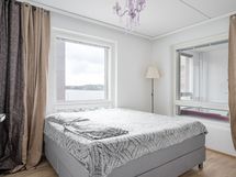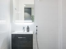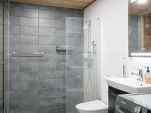 - Pesutilojen kuvaus: Tilava harmaan sävyinen kylpyhuone, varusteina suihku ja suihkuseinä, allaskaappi, peili, wc-istuin, bidésuihku, liitäntä pyykinpesukoneelle.