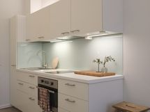 - Paljon kaappitilaa, Laminaattitasot, Integroidut koneet, Induktioliesi, Liesituuletin, Jääkaappi, Pakastin, Erillinen mikroaalto-tavallinen yhdistelmäuuni. Astioiden kuivauskaappi (ei astianpesukonetta).