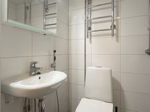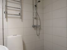 - Suihku, pyyhekuivausteline, peilikaappi, lattialämmitys, laattaseinä, laattalattia.