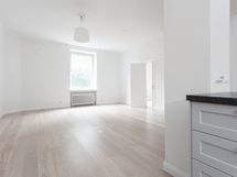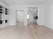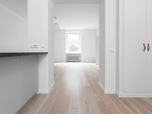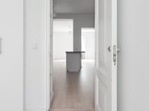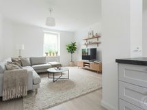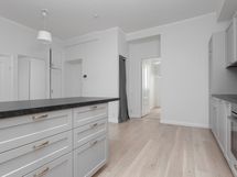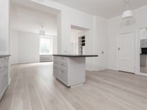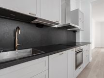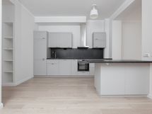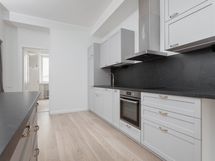 - Keittiön varusteet: Jääkaappipakastin, erillisuuni, liesi, liesituuletin, astianpesukone ja keittiösaareke. Työtason materiaali: Laminaatti.